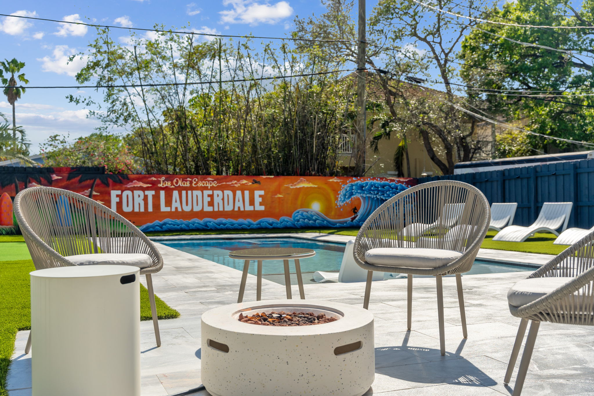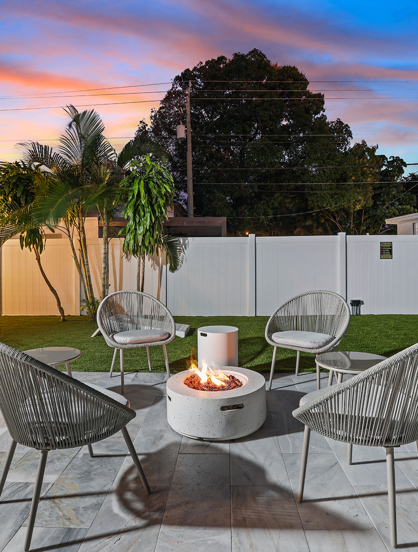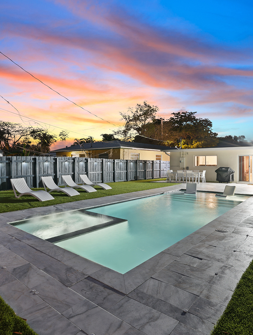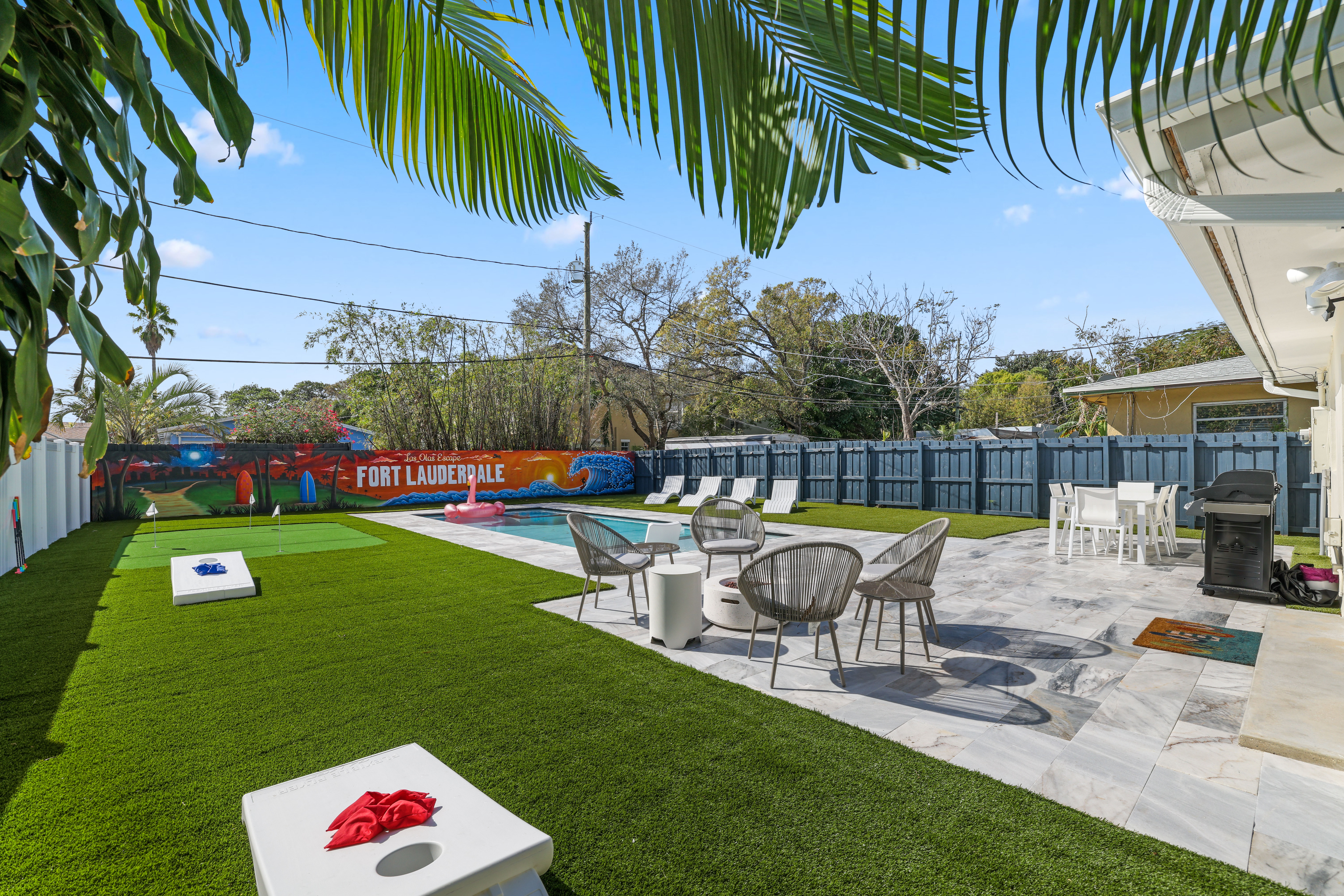 This backyard is a paradise full of fun, boasting a mini golf putting green, corn hole, a luxurious heated salt water pool with in-pool chairs, cozy loungers, a BBQ grill and inviting fire pit.